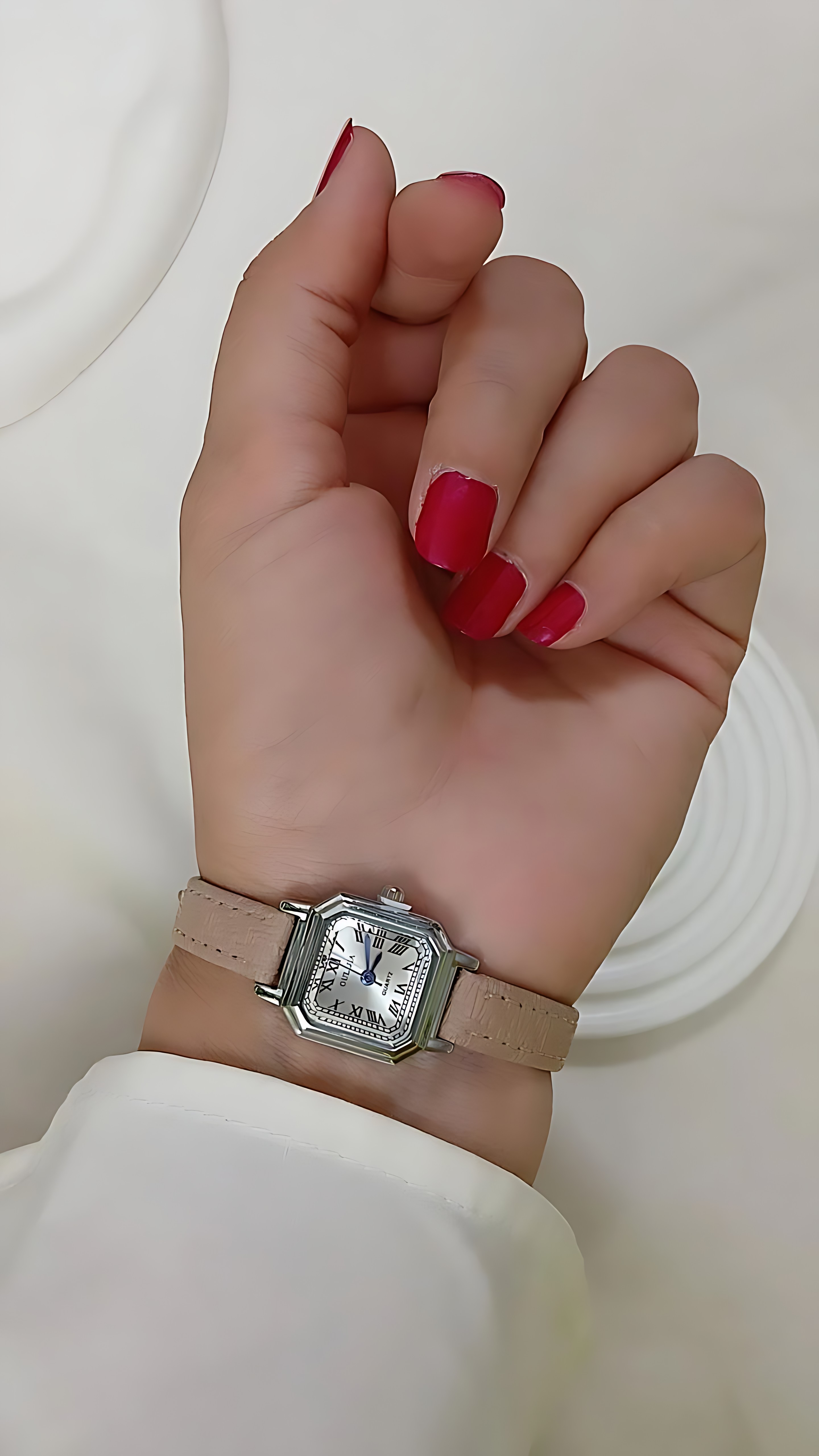 ساعت بند چرمی به رنگ نسکافه ای با صفحه ی خاص و اعداد یونانی دوخت ظریف دور چرم و انعطاف بالای چرم جز ساعتمچی مینیمال در رنگبندی متنوع