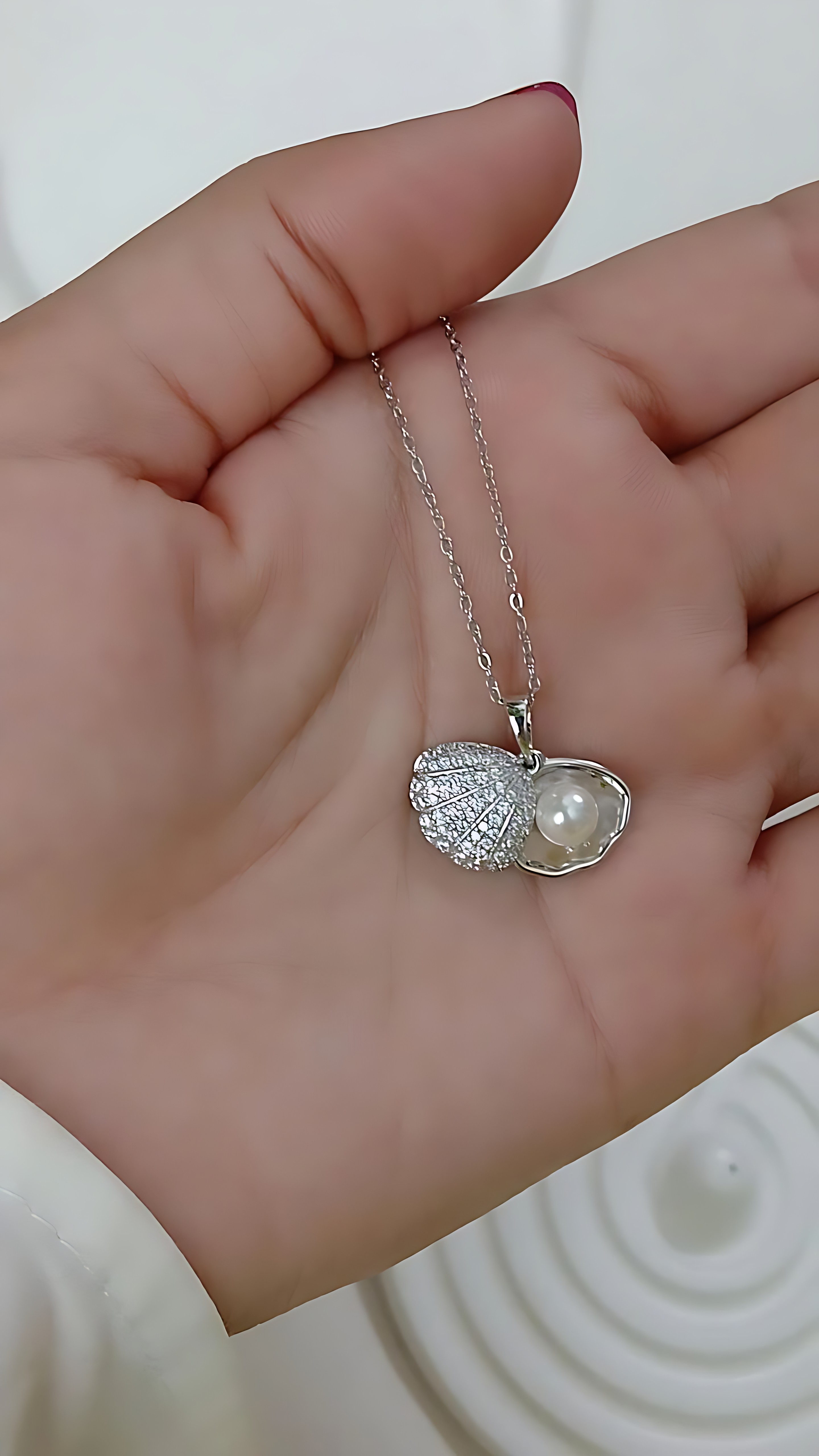 گردنبند صدف با نگین های مخراج کاری شده روی صدف و مروارید پرورشی داخل صدف رنگ ثابت بدون حساسیت از برند ژوپینگ طول زنجیر 45 سانت