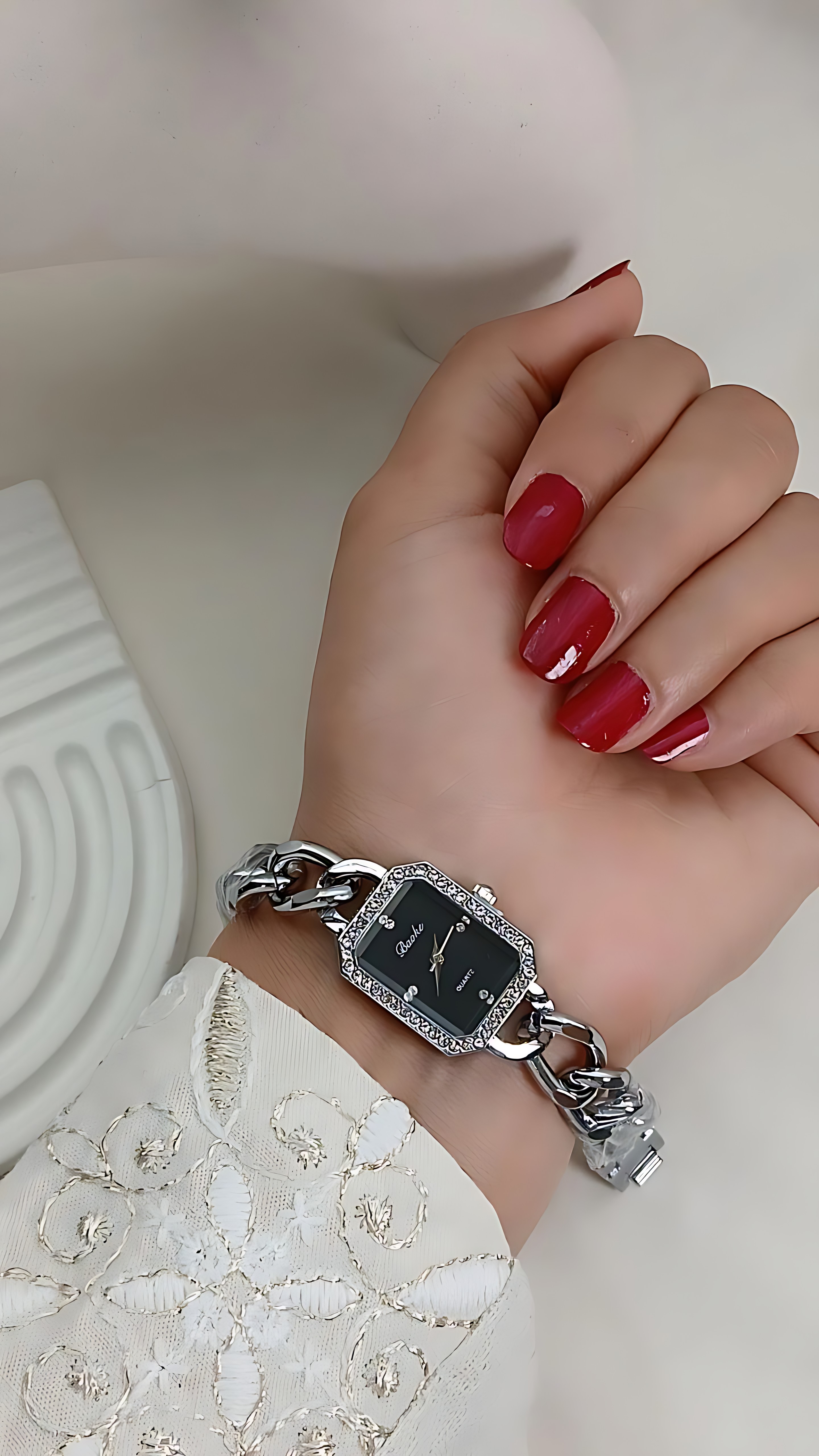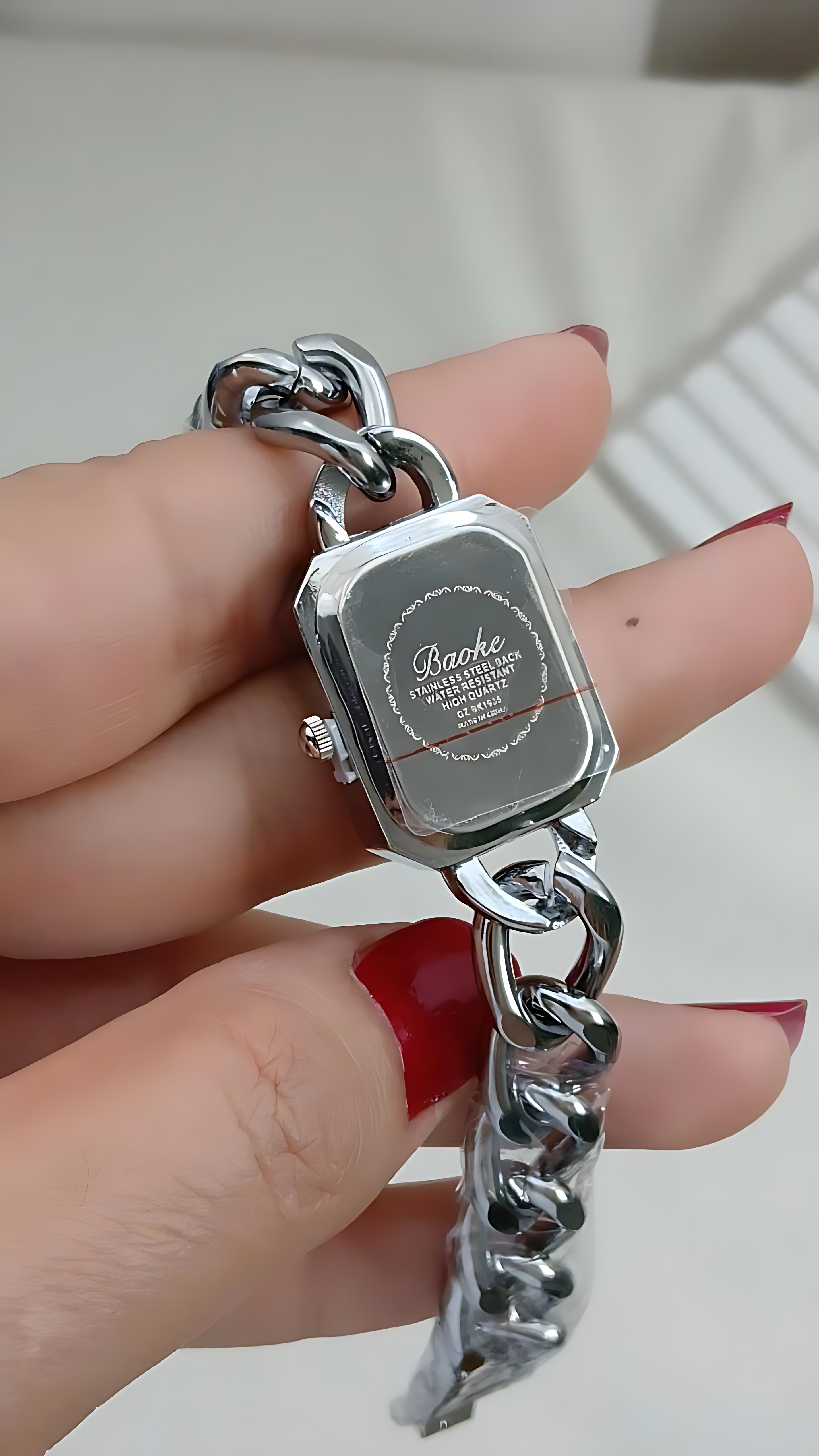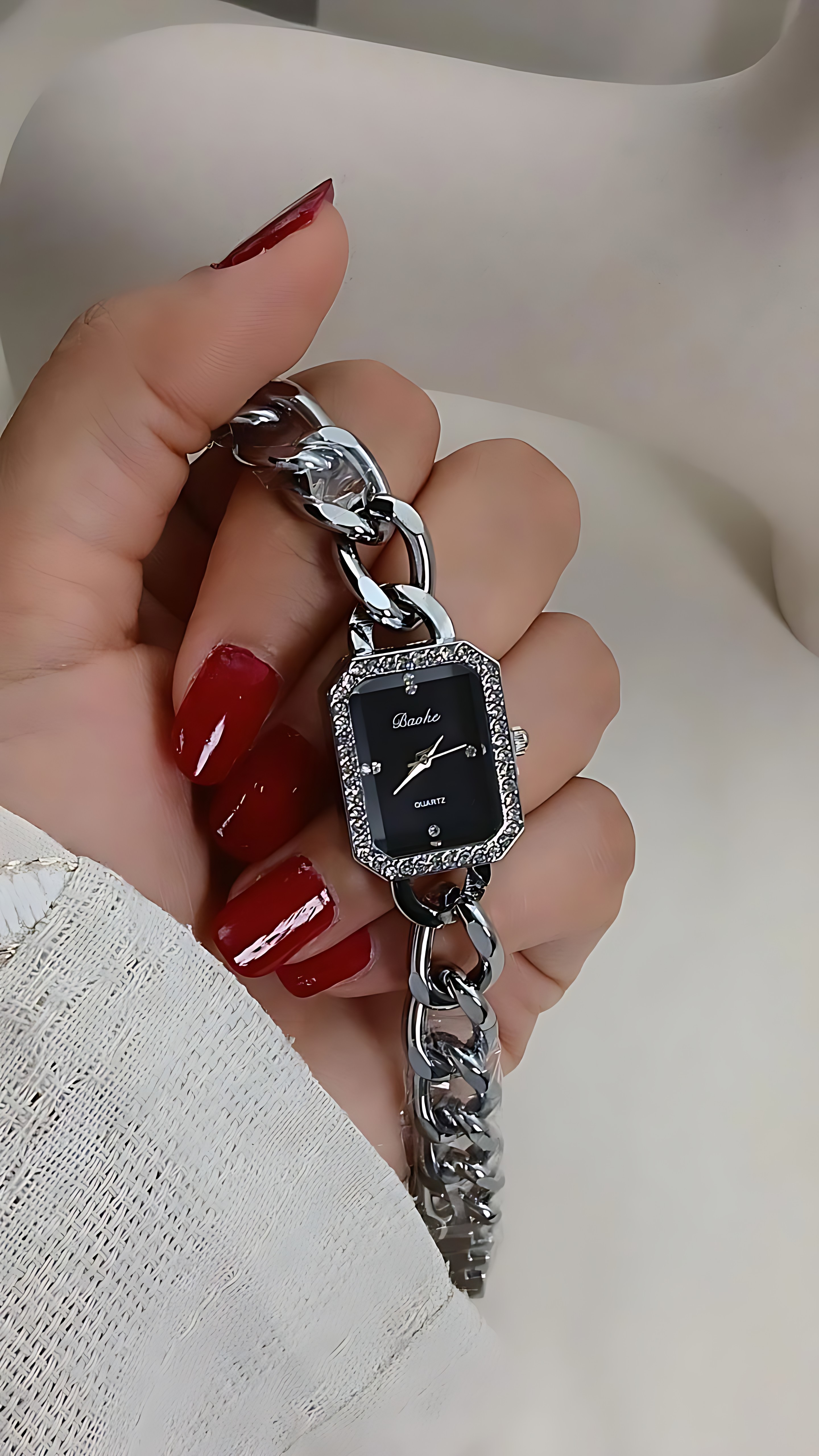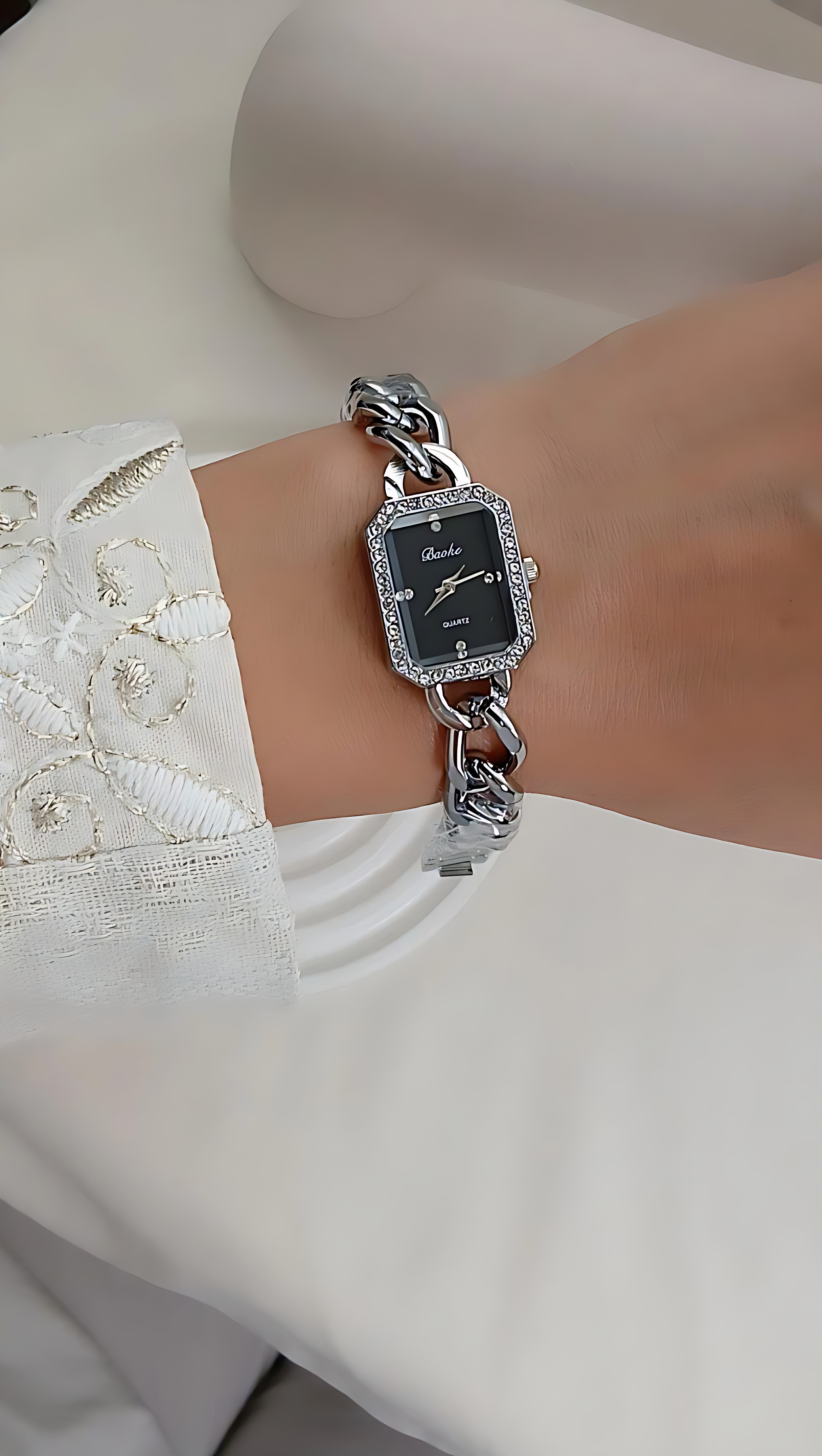 ساعتمچی با بند کارتیه با کیفیت بالا صفحه مستطیلی مشکی با بک و بند استیل و حک روی قفل دور صفحه نگین دار و مدل قفل دستبندی رنگ ثابت