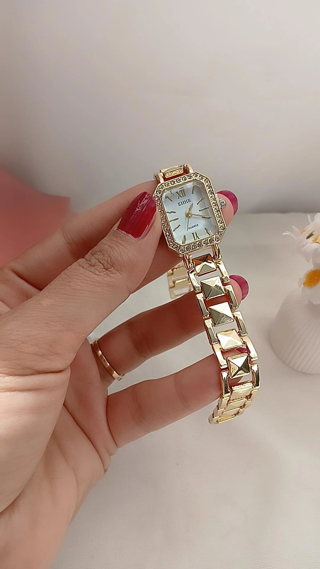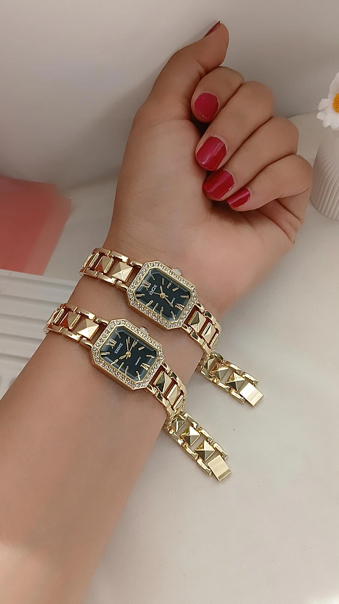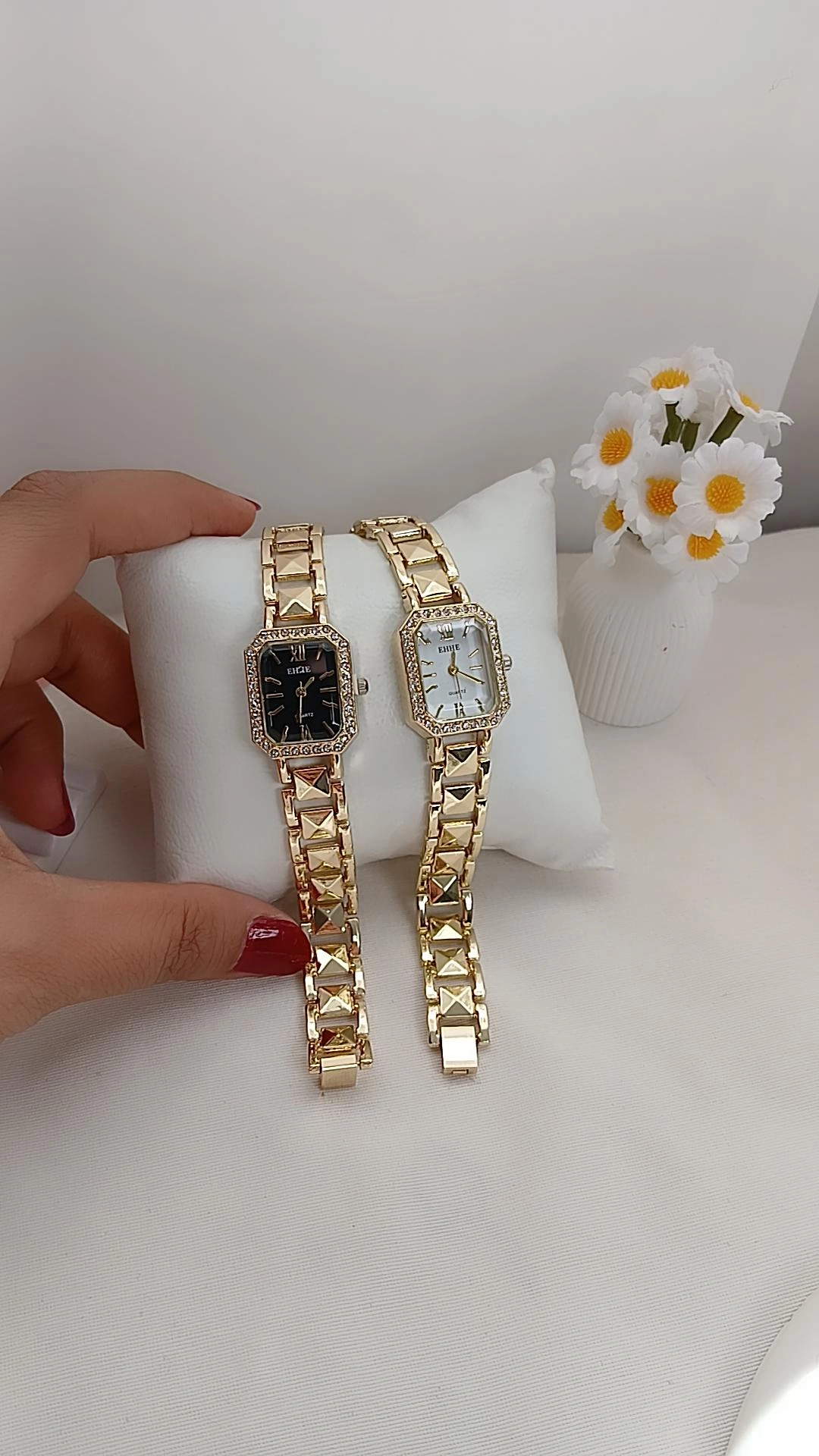 ساعت مچی زنانه با صفحه مستطیلی و بند بسیار زیبا با دو رنگ صفحه ی پر طرفدار و دور صفحه نگین دار